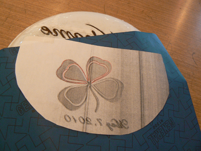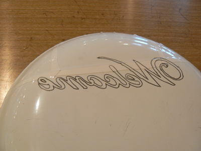 ①ガラスの上にイラストを貼ったカーボン紙を置きボールペンでなぞります。
