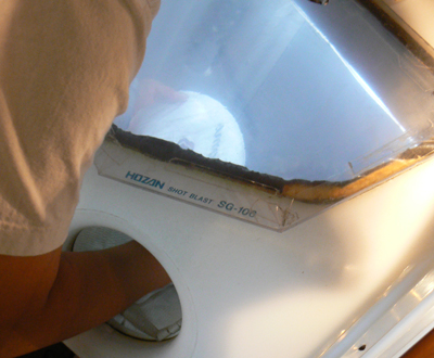 ③ガラスがむき出しになったら、サンドブラスターと呼ばれる専用工具で磨りガラスに仕上げれば完成
