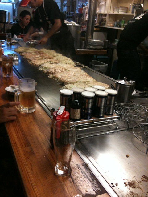縦の写真は少し分かりにくいですが、20枚くらいのお好み焼きを一気に焼いている様。