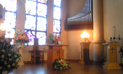 20mものバージンロード、開放感あふれる高さの天井、そしてステンド