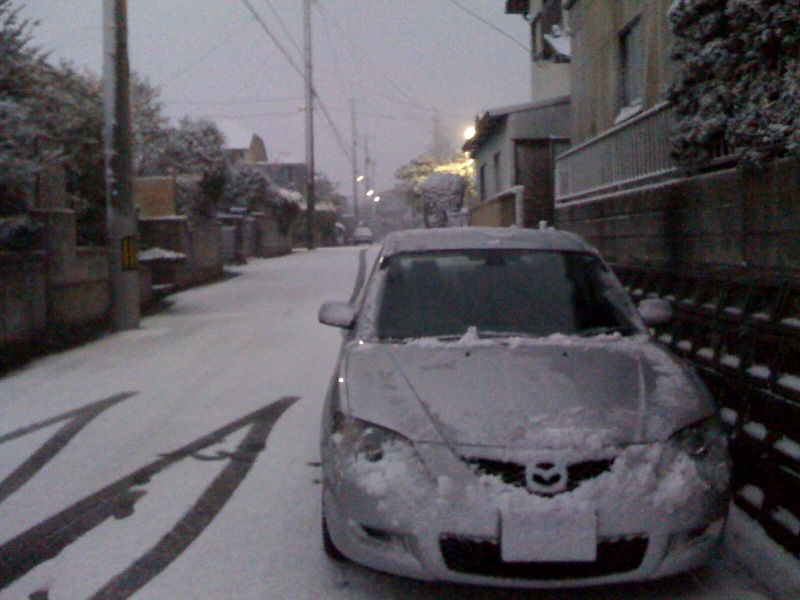 写真は、帰宅直後の様子。道路はもちろん、車まで真っ白です、雪が…。